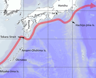 Kuroshio current or Japan current is similar to Gulf Stream but in the Pacific Ocean. It is fast, relatively deep and narrow. It transfers warm tropical water northwards towards the polar region. The warm waters of Kuroshio current are vital for the coral reefs of Japan which are the northernmost coral reefs in the world.