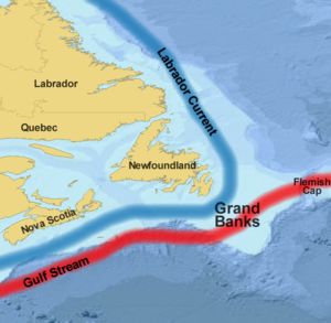 The Labrador current is cold in the North Atlantic and flows southwards along the western side of the Labrador Sea. The current passes along the eastern coasts of Canada. It carries a significant amount of water but also numerous icebergs southwards. Labrador current was responsible for carrying the famous iceberg which led to Titanic’s shipwreck in 1912. Additionally, the cold Labrador current can create ship navigational problems as in the regions where the cold current meets the warm from the Gulf, fog forms and can be quite thick. On the other hand, Labrador Current is quite important as its cold waters (<0oC) and its low salinity support the diversity of sea life including the famous Atlantic Cod and American plaice.