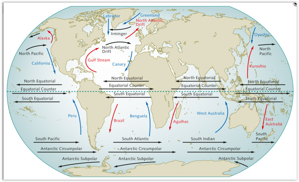 Other known, important but smaller currents are: Kuroshio current, Peru (Humboldt) current, California and Labrador current.