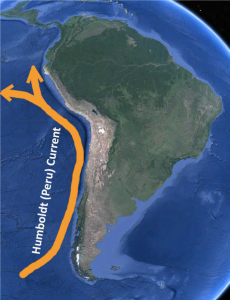 Peru current or Humbolt current is a relatively slow and shallow current of the southeast Pacific. It is reinforced by the West Wind Drift and it is a cold current apart from the times when El Nino takes place. Peru Current brings coastal fog but it also brings moisture to one of the most arid regions in the world. The cold flow is intensified by upwelling of deep water full in nutrients which in combination with the sun, allows rich plankton to grow. This is why Peru, Chile and Equador coasts are famous for their fishing grounds for anchovies and tuna.