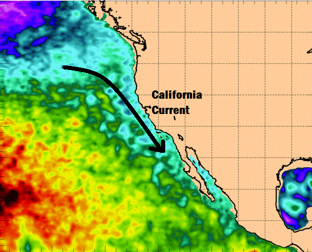 The California current flows southward along the west coast of North America. It is considered as a major current associated with strong upwelling zones supporting abundant plankton and animal life. California Current is a continuation of the Kuroshio current from Japan which causes an outland transport of cool water from high latitudes along the California coast to make this area highly productive.