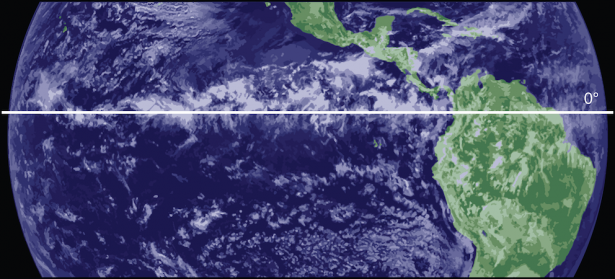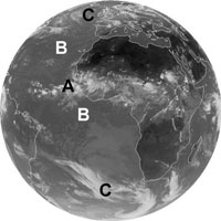 The above infrared (IR) image from METEOSAT shows how the global cloud patterns are formed by the prevailing winds. The Inter-Tropical Convergenze Zone (ITCZ) is marked by a belt of tall clouds (A) near the equator. On either side of this, are the clearer skies of the subtropics (B), and closer to the poles on each side, the region of the Westerlies (C) where cloud cover is more variable. In this thermal infrared image, cold regions are bright, and warm regions are dark.