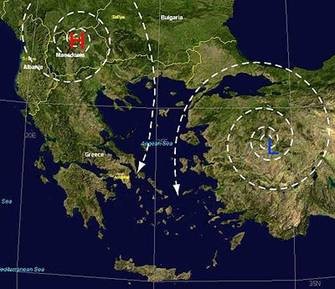 During summer months hot air masses in India ascend through the atmosphere. This ascending air creates a barometric low pressure system over India which extends towards Turkey and Cyprus. On the other hand the stable barometric high pressure system over Azores extends towards Europe and particularly towards Balcans. This combination of high pressure in the northwest and low pressure in the south east leads to meltemia to be established as it can be seen in the picture below. This big difference in pressures (high in the north west, low in the south east), can make meltemia reach really high wind speeds over the Aegean sea as mentioned earlier.